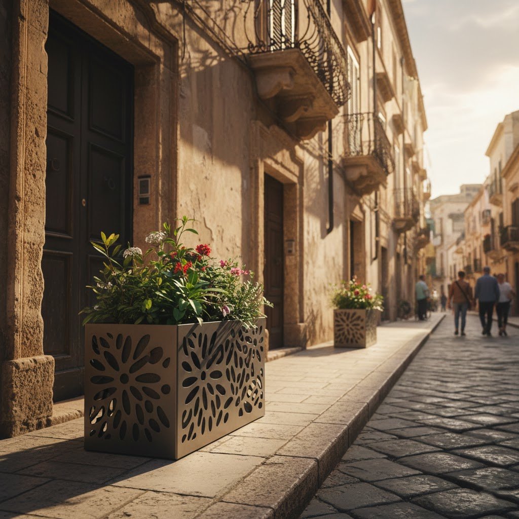 • Design per Esterni: Cancellate, ringhiere, portoni laser-cut e fioriere zincate.